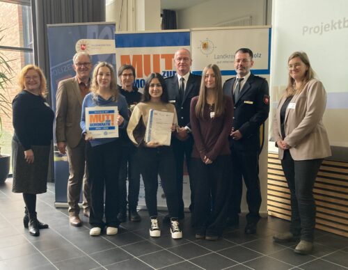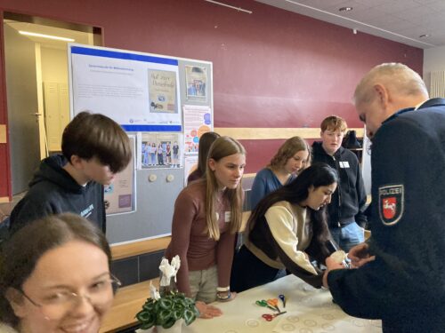 Am 11.11.2025 fand am Gymnasium in Twistringen die Abschlussveranstaltung der ersten Ausbildungsrunde im Projekt „Mut zur Demokratie“ statt. Neben feierlichen Redebeiträgen präsentierten alle teilnehmenden Schulen ihr Demokratieprojekt auf einem Markt der Möglichkeiten. Wir haben Demokratiebuttons hergestellt, die wir auch bald in der Demokratiesprechstunde anbieten werden. Die 1. Generation der Demokratiepat*wurden mit einer Urkunde geehrt. Auch die 2. Generation bekam ihre Auszeichnung. Diese Schülerinnen und Schüler sind weiterhin dabei und werden im Frühjahr ihre neuen Kolleg*innen ausbilden. Für die neue Ausbildung bei Mut zur Demokratie können sich Interessierte der 8. Und 9. Klassen bis zum 3.12.2025 bewerben: schreibt dafür Euren Namen und Eure Klasse auf und beschreibt kurz, warum ihr dabei sein wollt. Eure „Bewerbung“ dann bitte bei Frau Liesaus abgeben. Viel Erfolg!
