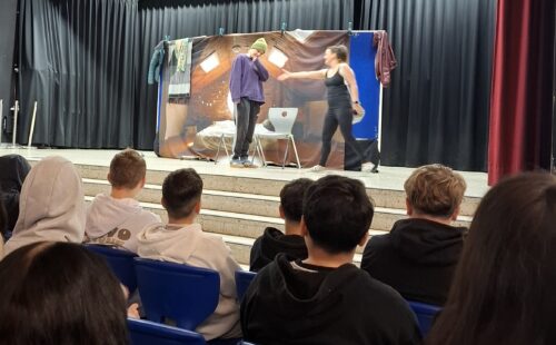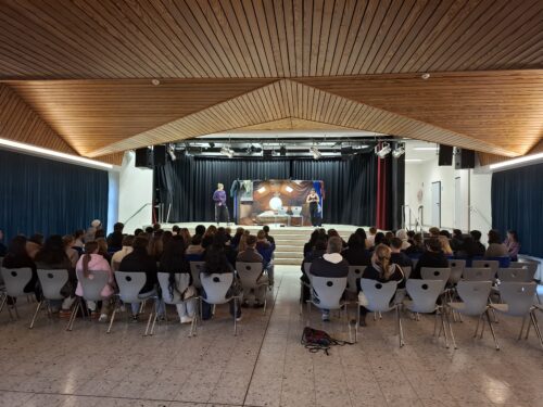 Die Schülerinnen und Schüler verfolgten die Aufführung aufmerksam und waren sichtlich bewegt von der authentischen Darstellung. Im anschließenden Gespräch bot sich Raum für Fragen und ehrliche Gespräche – ein wertvoller Moment, um das Gesehene zu reflektieren, Auslöser und Symptome einer Esssucht zu erkennen, Hilfsangebote kennen zu lernen und den eigenen Umgang mit Körperbild und Selbstwert zu hinterfragen.